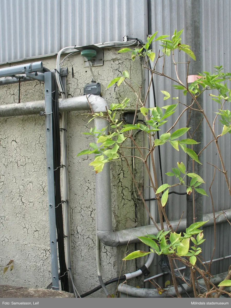 En växt med gröna blad framför en vägg med sprickor i putsen. Rör och elledningar är monterade på fasaden. Soabs industrianläggning i Mölndals Kvarnby, år 2007. Anläggningen användes vid fototillfället av Hexion Speciality Chemicals Sweden AB.