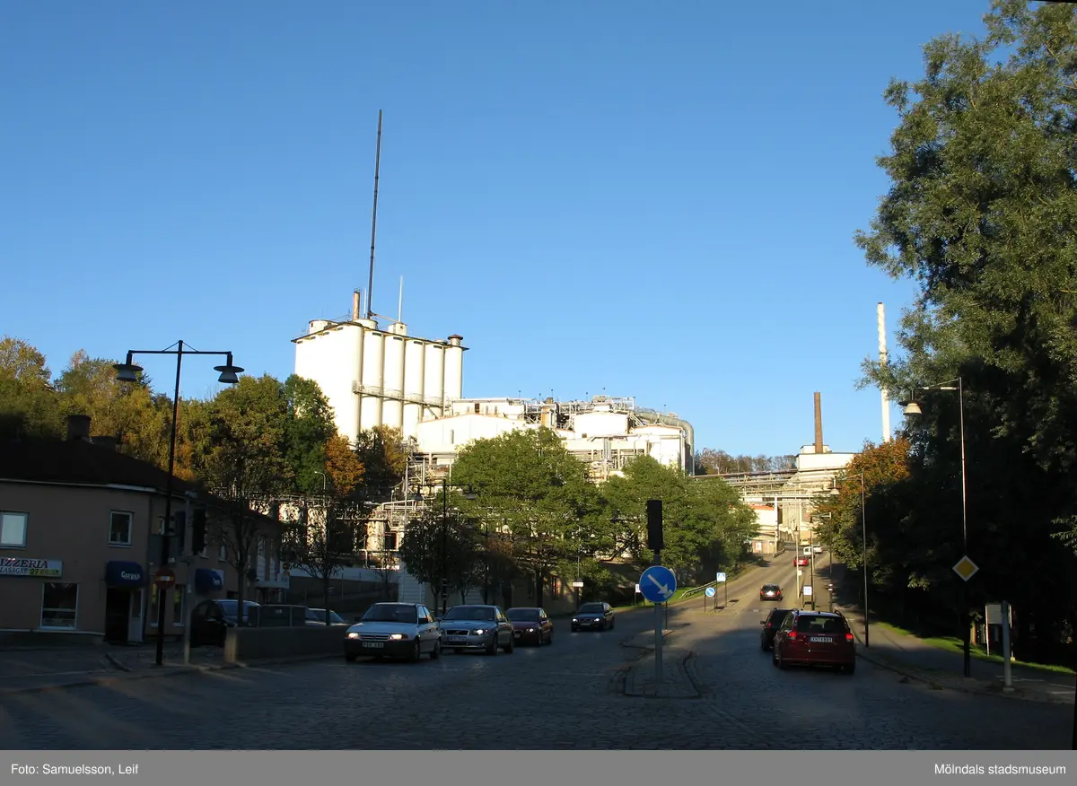 Vy från Kvarnbygatan, intill Gamla torget, mot Soabs industrianläggning i Mölndals Kvarnby, år 2007. Vid fototillfället användes anläggningen av Hexion Speciality Chemicals Sweden AB.
