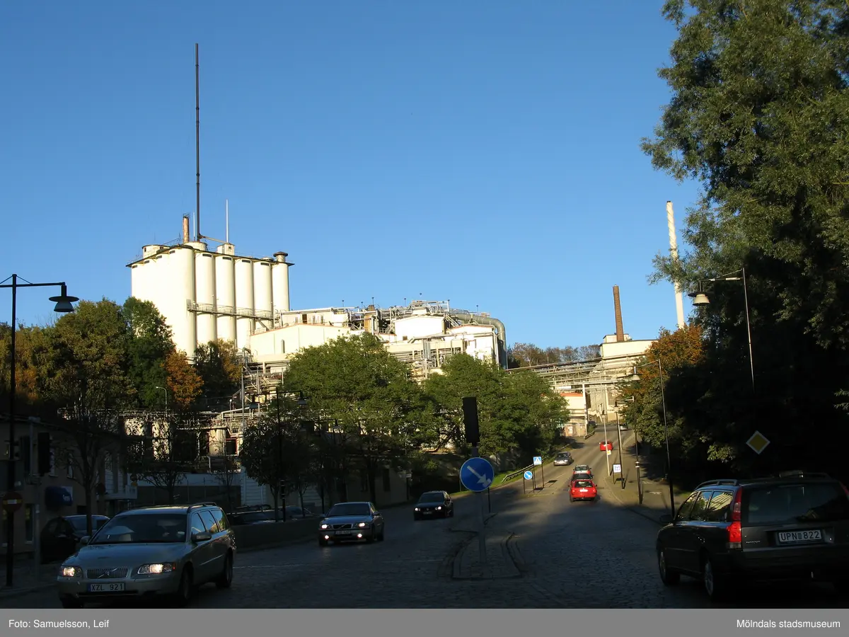 Vy från Kvarnbygatan, intill Gamla torget, mot Soabs industrianläggning i Mölndals Kvarnby, år 2007. Vid fototillfället användes anläggningen av Hexion Speciality Chemicals Sweden AB.