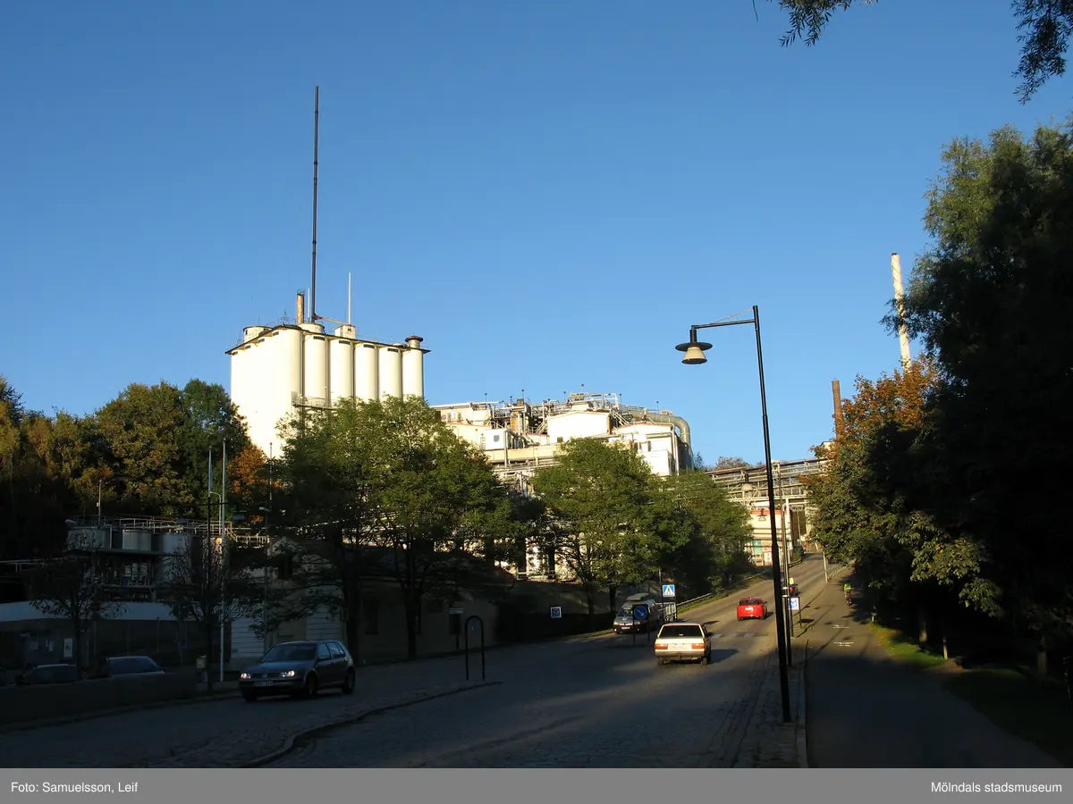 Vy från Kvarnbygatan, intill Gamla torget, mot Soabs industrianläggning i Mölndals Kvarnby, år 2007. Vid fototillfället användes anläggningen av Hexion Speciality Chemicals Sweden AB.