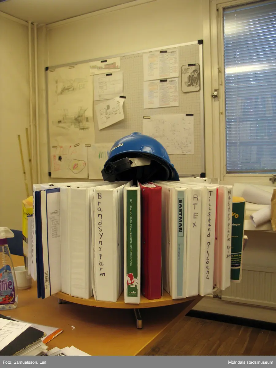 Ett roterbart ställ med pärmar på ett bord. På pärmarna har någon lagt en hjälm. Interiörfotografi från byggnad vid Soabs industrianläggning i Mölndals Kvarnby, år 2007. Anläggningen användes vid fototillfället av Hexion Speciality Chemicals Sweden AB.