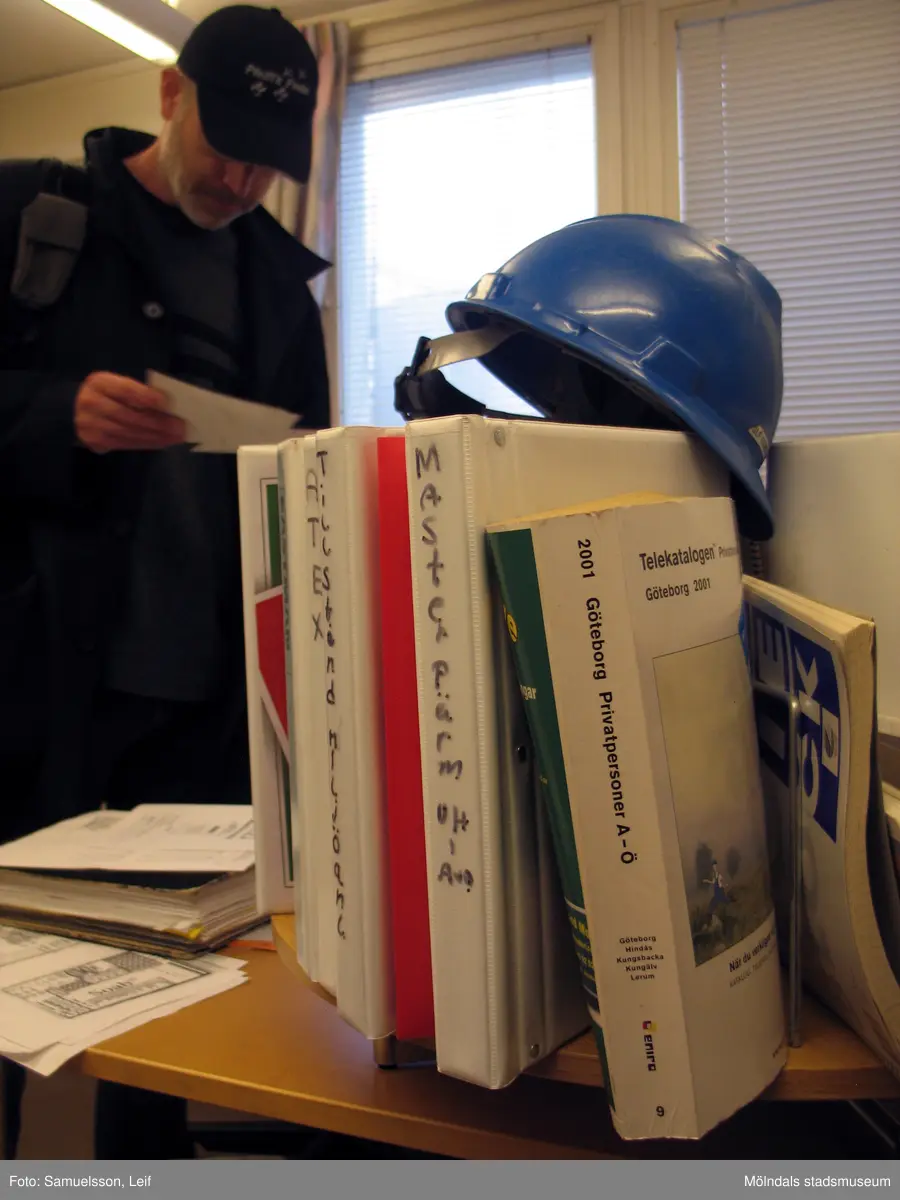 Ett roterbart ställ med pärmar på ett bord. På pärmarna har någon lagt en hjälm. I bakgrunden står en man iförd keps. Interiörfotografi från byggnad vid Soabs industrianläggning i Mölndals Kvarnby, år 2007. Anläggningen användes vid fototillfället av Hexion Speciality Chemicals Sweden AB.