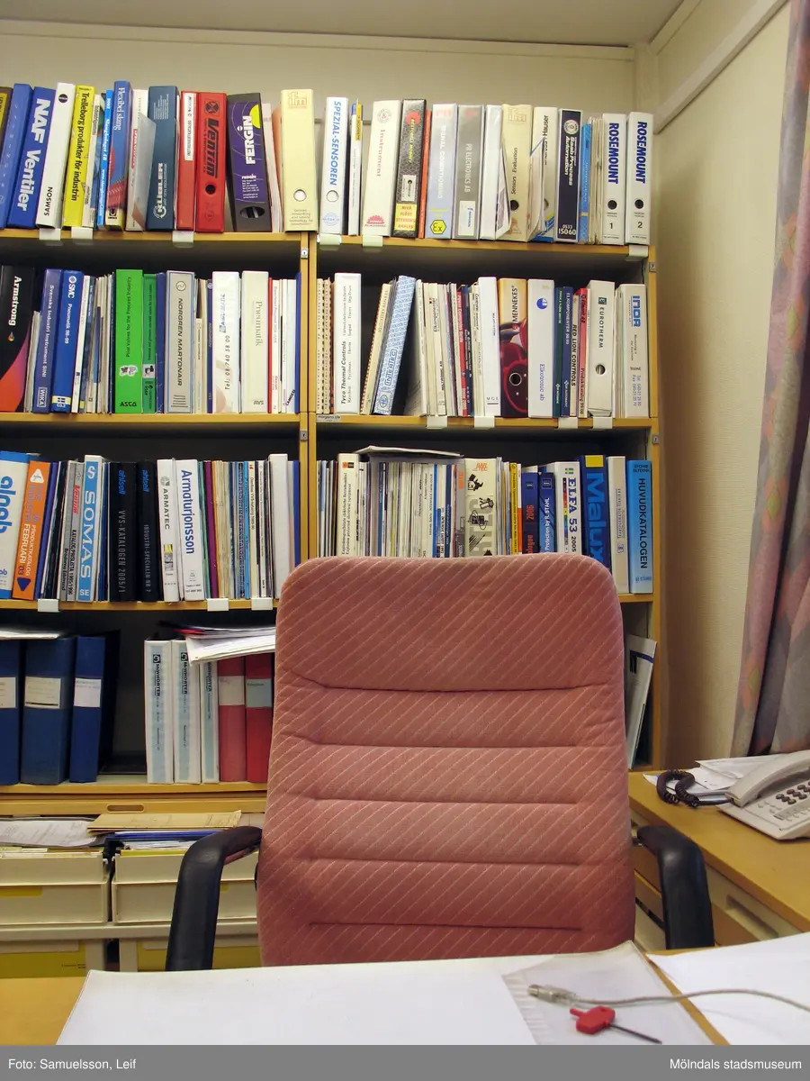 Kontorsplats med skrivbord och en stol. Bakom står hyllor fulla av pärmar. Interiörfotografi från byggnad vid Soabs industrianläggning i Mölndals Kvarnby, år 2007. Anläggningen användes vid fototillfället av Hexion Speciality Chemicals Sweden AB.