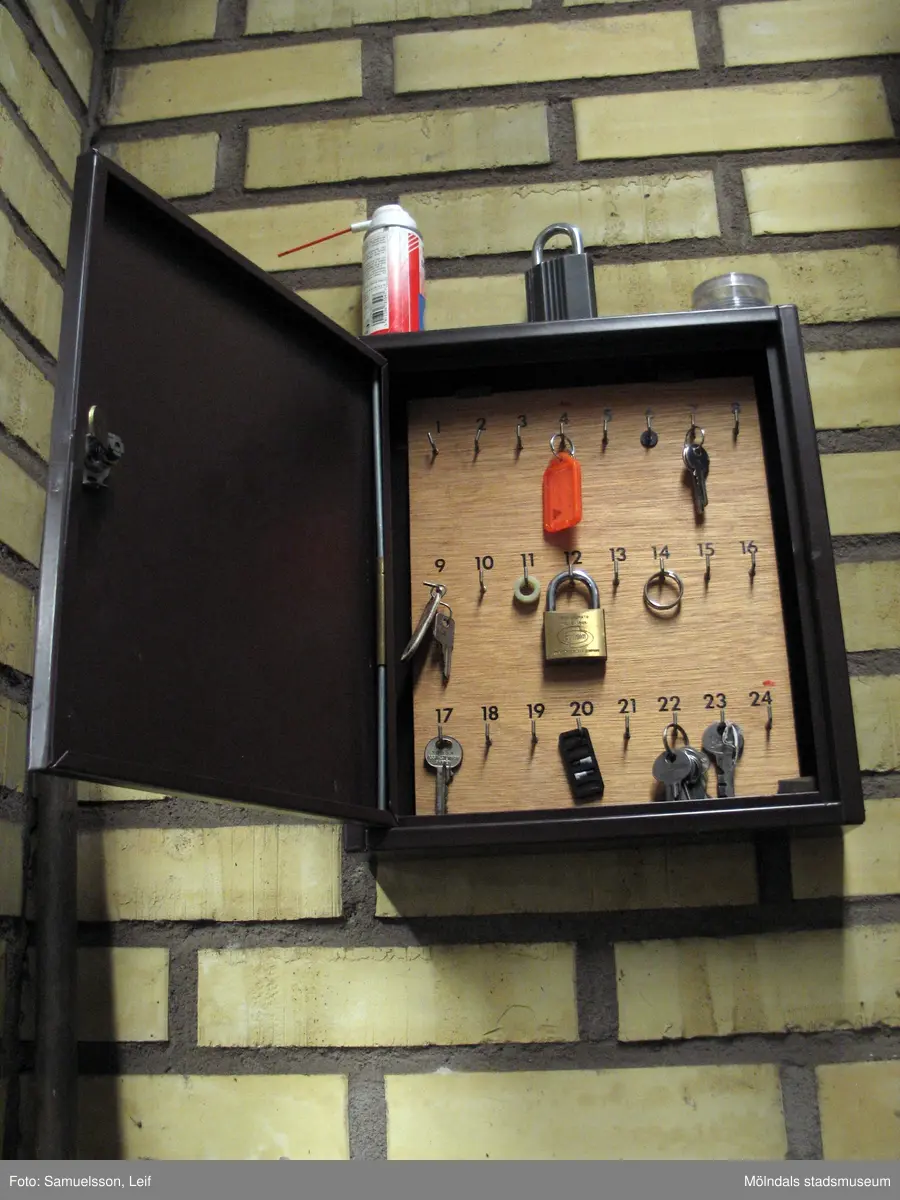 Ett öppet nyckelskåp. På krokarna i skåpet hänger nycklar och ett hänglås. På skåpet står en sprejburk och ytterligare ett hänglås. Interiörfotografi från byggnad vid Soabs industrianläggning i Mölndals Kvarnby, år 2007. Anläggningen användes vid fototillfället av Hexion Speciality Chemicals Sweden AB.