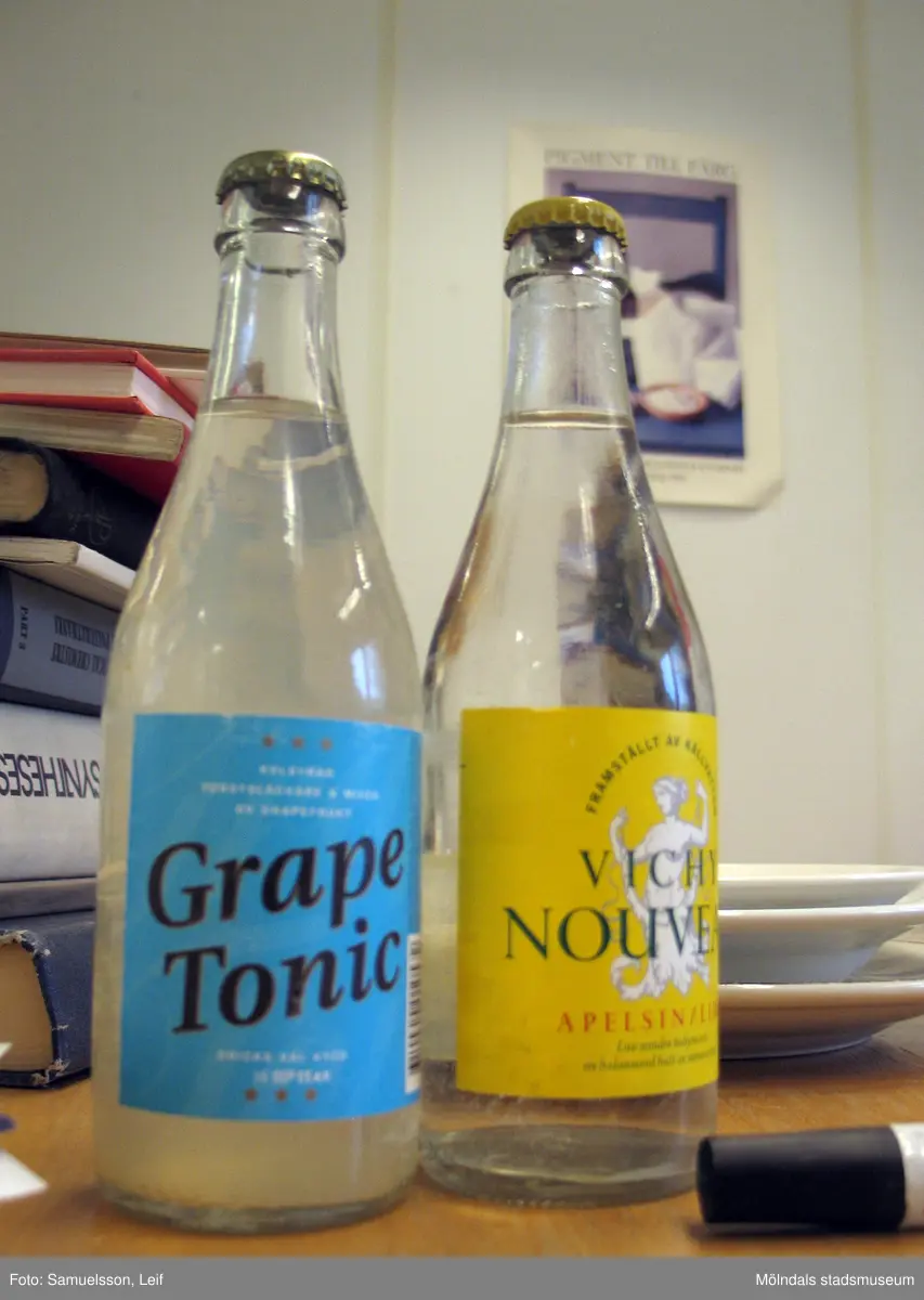 Två dricksflaskor på ett bord. Den ena Grape Tonic, den andra Vichy Nouveau. Interiörfotografi från byggnad vid Soabs industrianläggning i Mölndals Kvarnby, år 2007. Anläggningen användes vid fototillfället av Hexion Speciality Chemicals Sweden AB.