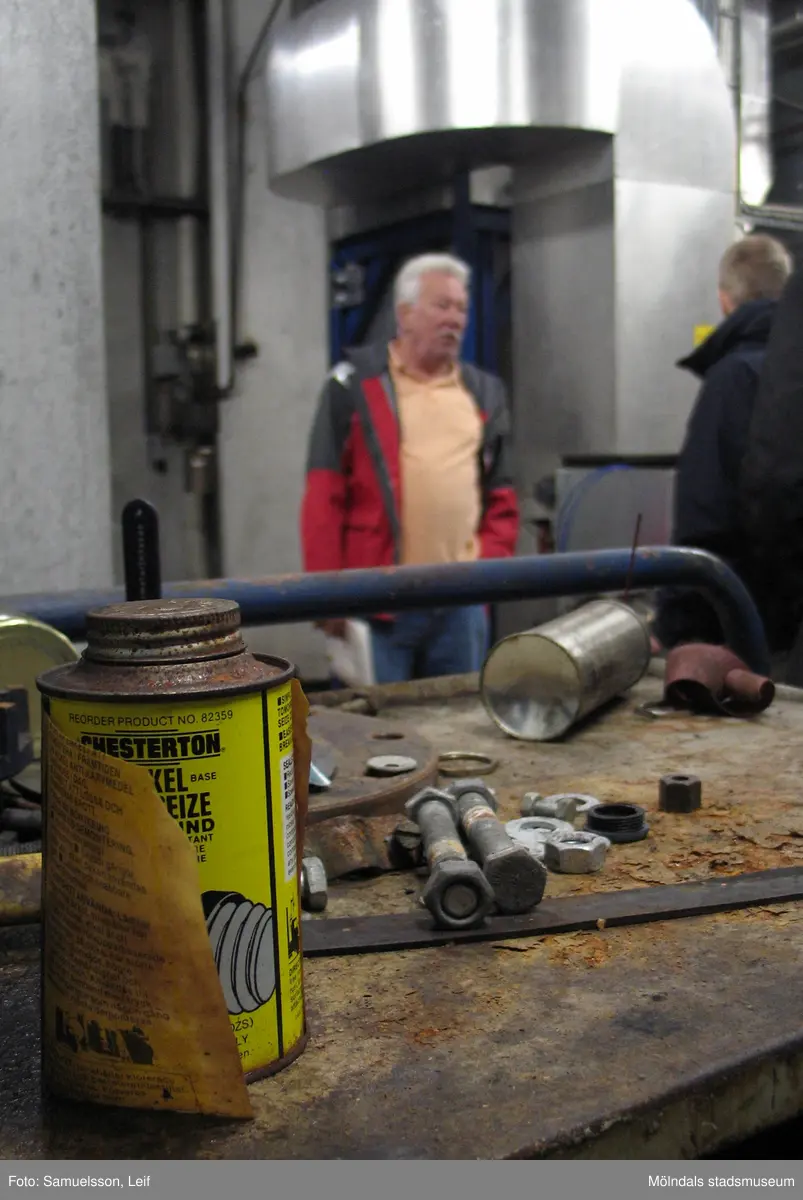 På ett bord står en plåtburk. Intill ligger ett par bultar och muttrar. I bakgrunden står några män. Interiörfotografi från byggnad vid Soabs industrianläggning i Mölndals Kvarnby, år 2007. Anläggningen användes vid fototillfället av Hexion Speciality Chemicals Sweden AB.