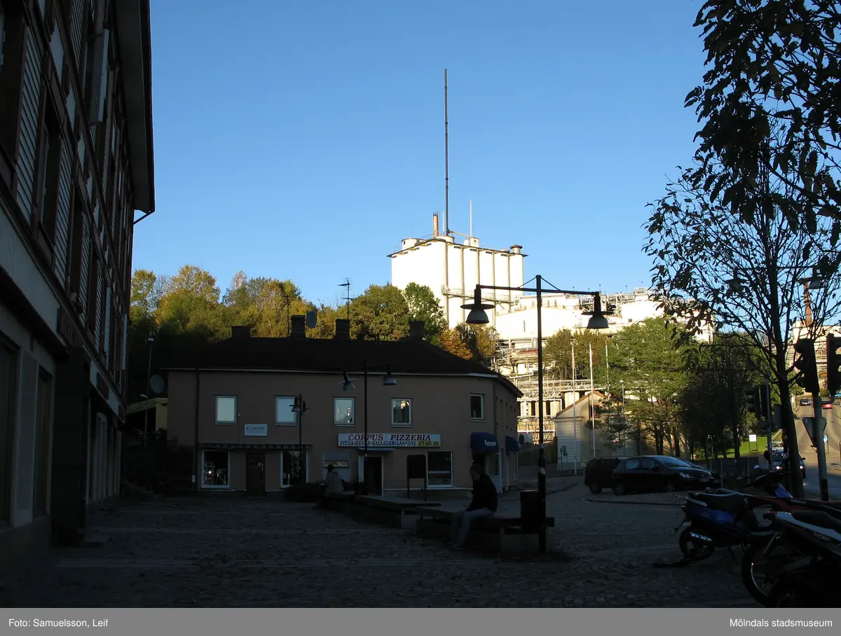 Vy från Gamla torget mot Soabs industrianläggning i Mölndals Kvarnby, år 2007. Närmast ses Gamla torget 43 och 45. Vid fototillfället användes anläggningen av Hexion Speciality Chemicals Sweden AB.