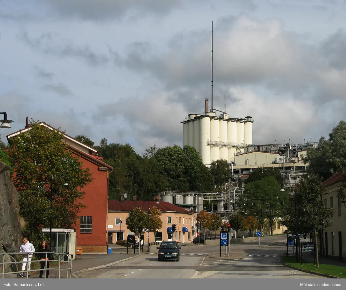 Vy från Kvarnbygatan, över Gamla torget, mot Soabs industrianläggning i Mölndals Kvarnby, år 2007. Vid fototillfället användes anläggningen av Hexion Speciality Chemicals Sweden AB.