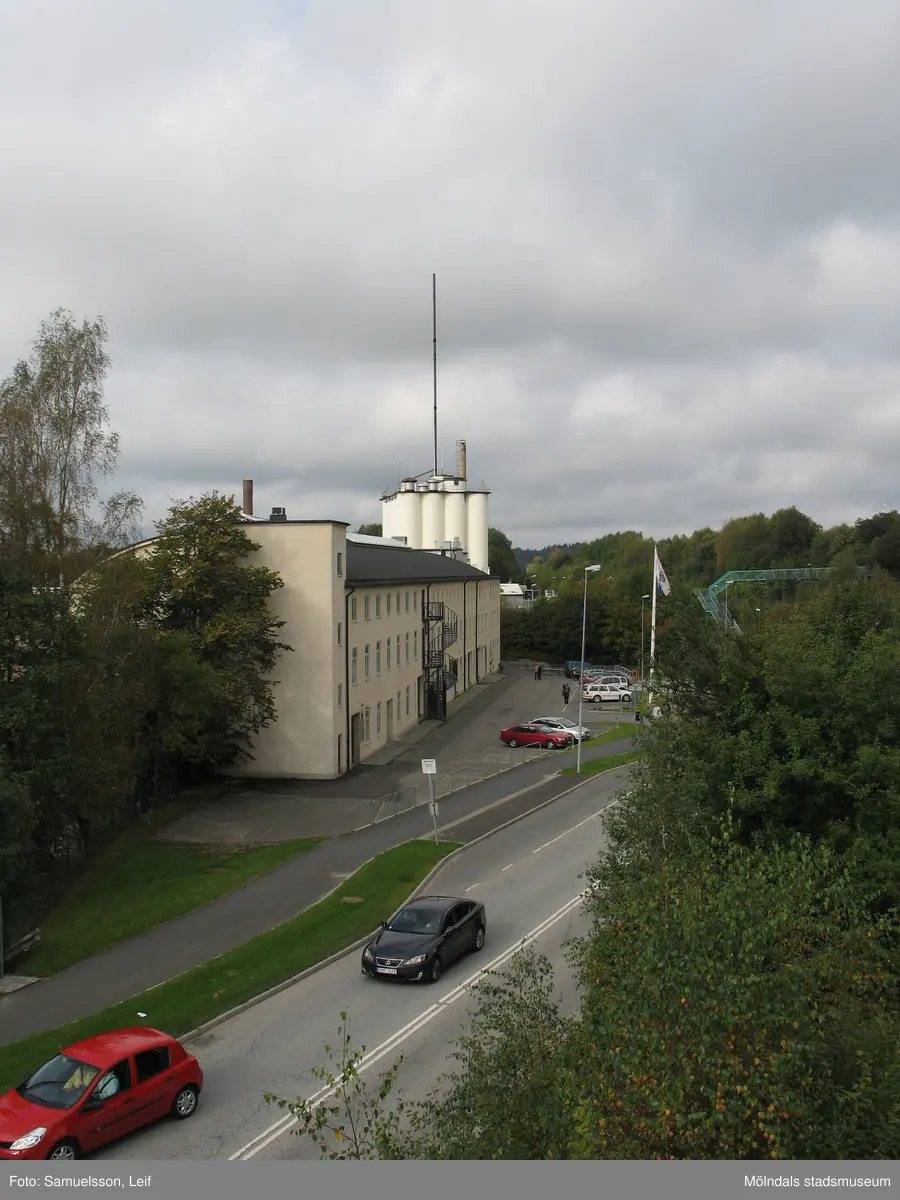 Vy från vägbron vid Stensjögatan mot industribyggnader vid Kvarnbygatan i Mölndals Kvarnby, år 2007. Närmast ses huset "Strumpan" och i bakgrunden Soabs silobyggnad som vid fototillfället användes av Hexion Speciality Chemicals Sweden AB.