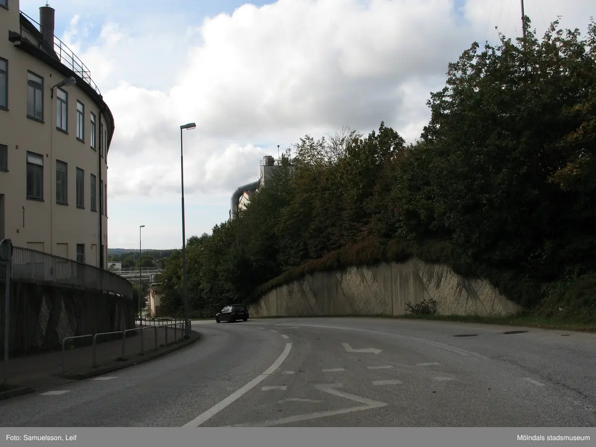 Byggnaden "Strumpan" till vänster och bakom grönskan skymtas industribyggnad vid Soabs industrianläggning i Mölndals Kvarnby, år 2007. Vy från "Kråkan", Kvarnbygatan. Anläggningen användes vid fototillfället av Hexion Speciality Chemicals Sweden AB.