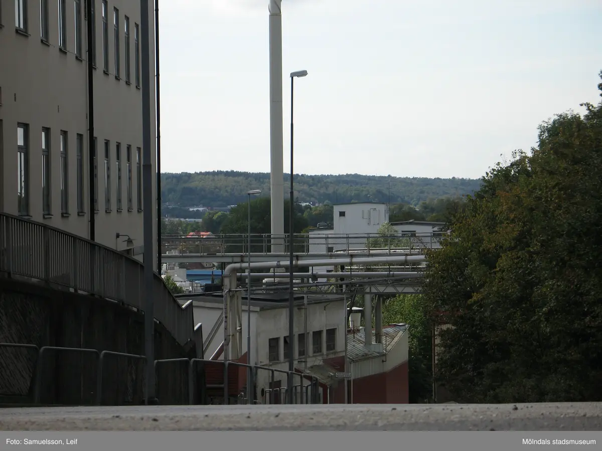 Vy från "Kråkan", Kvarnbygatan, mot industribyggnader vid Soabs industrianläggning i Mölndals Kvarnby, år 2007. Närmast ses byggnaden "Strumpan". Anläggningen användes vid fototillfället av Hexion Speciality Chemicals Sweden AB.