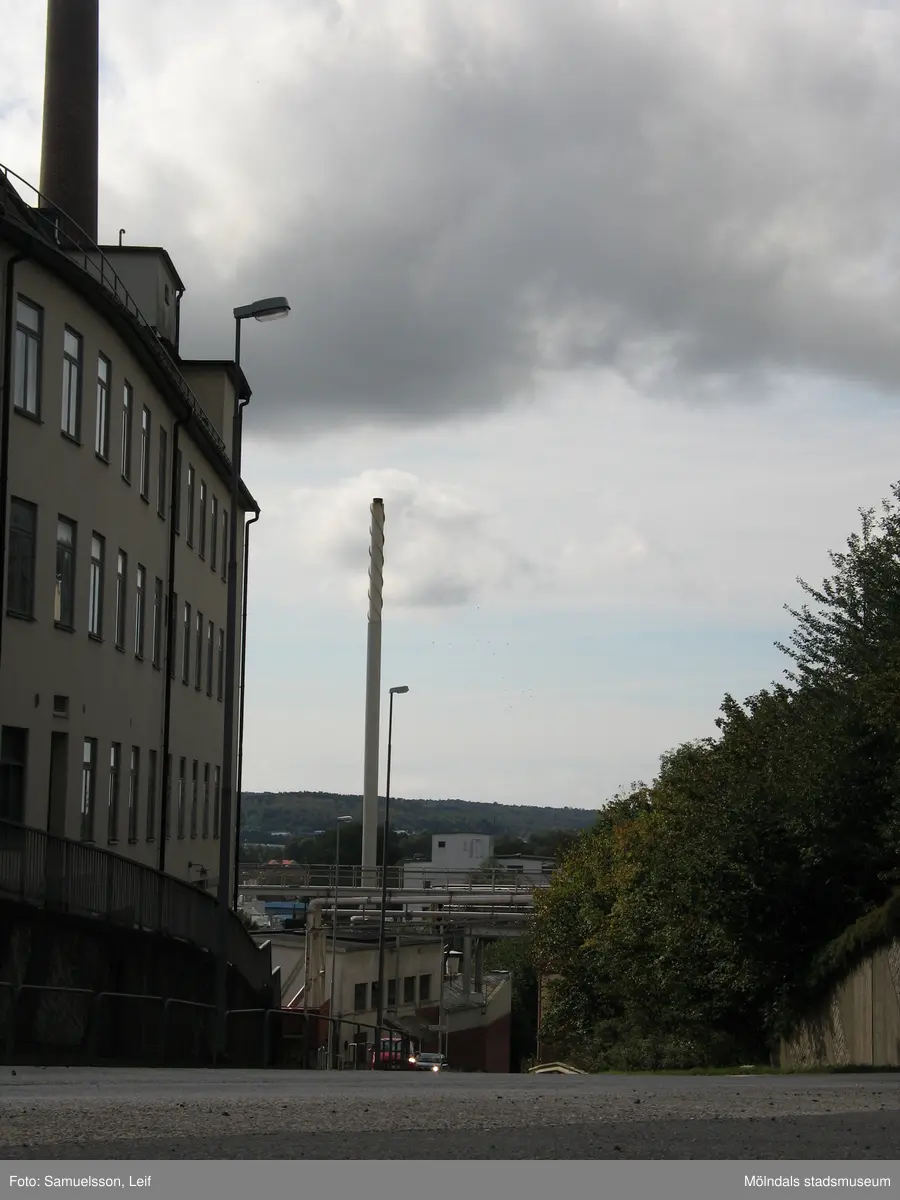 Vy från "Kråkan", Kvarnbygatan, mot industribyggnader vid Soabs industrianläggning i Mölndals Kvarnby, år 2007. Närmast ses byggnaden "Strumpan". Anläggningen användes vid fototillfället av Hexion Speciality Chemicals Sweden AB.