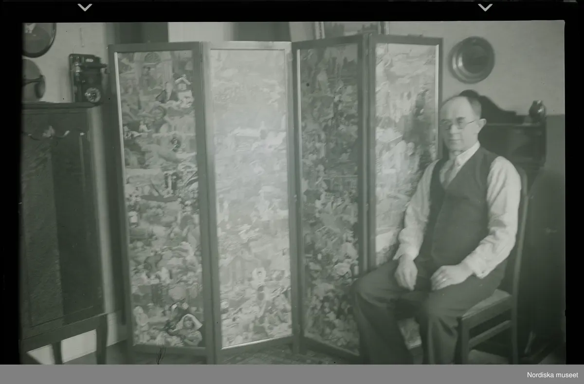 Titel: En man sittandes intill en mönstrad vikskärm.
