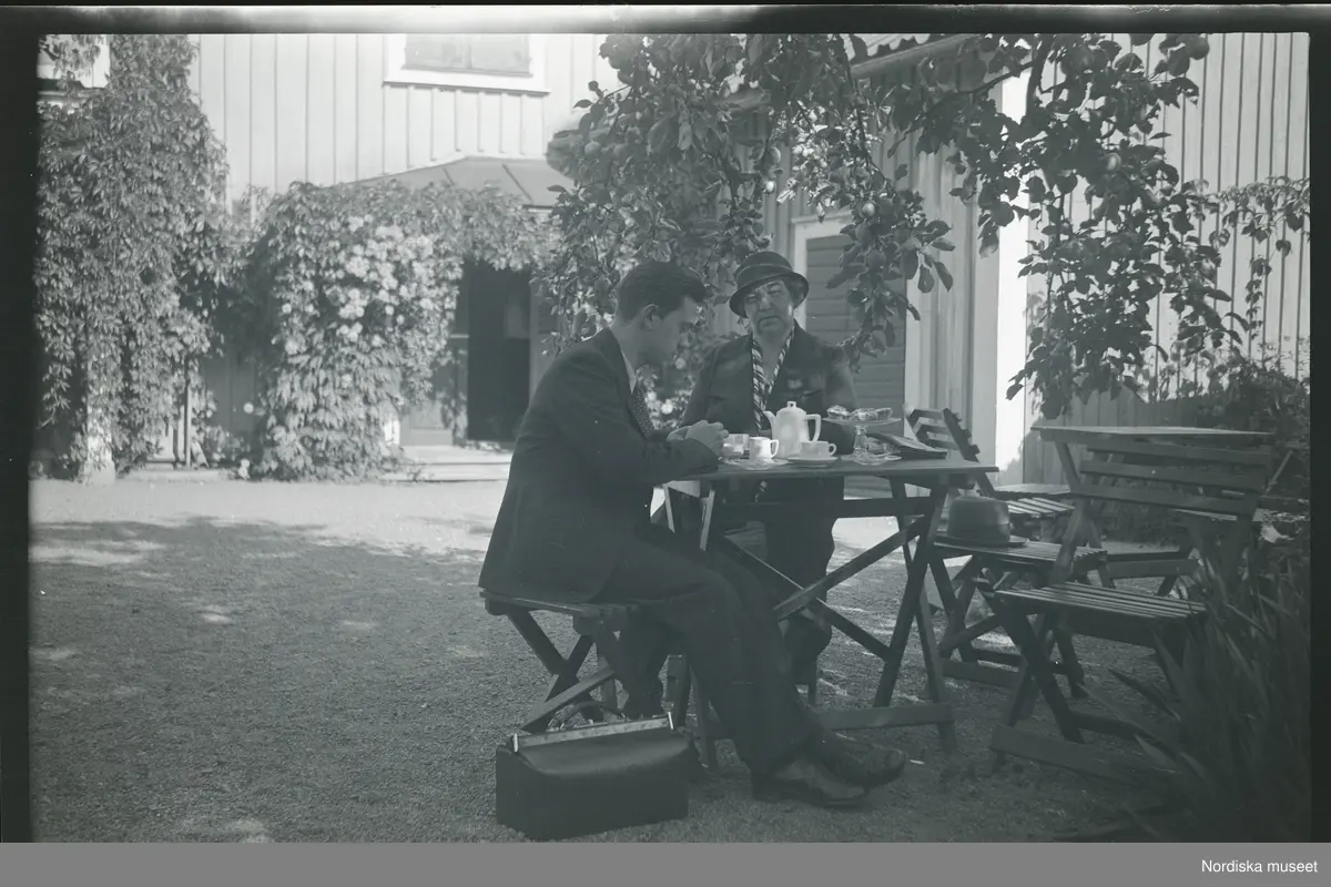 En man och en kvinna sitter vid ett bord i en trädgård och dricker kaffe.