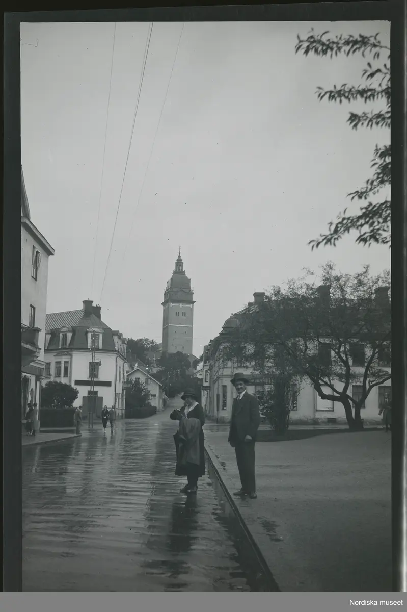 En man och en kvinna står på torget, Gyllenhjelmsgatan i Strängnäs, domkyrkan i bakgrunden.