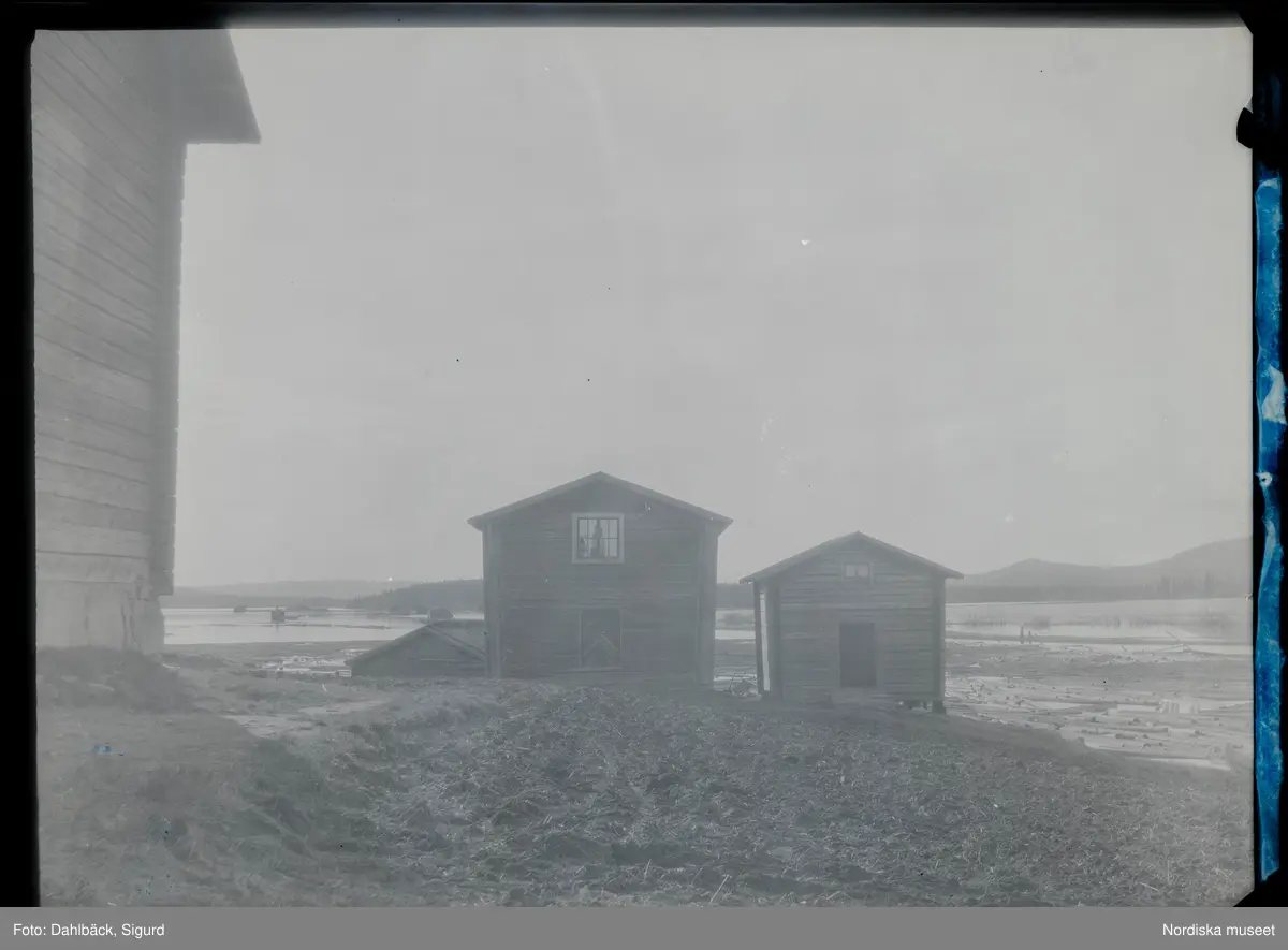 Fotografens anteckning: ”1. Från N. P. Mikaelssons hemman av nr. 2 Övre Lansjärv, nordligast i byn: utsikt mot N.V. uppför Skrövälven vid dess utlopp i Övre lansjärvsjön. Vårhögvatten, lösflottning. Foto 1924."