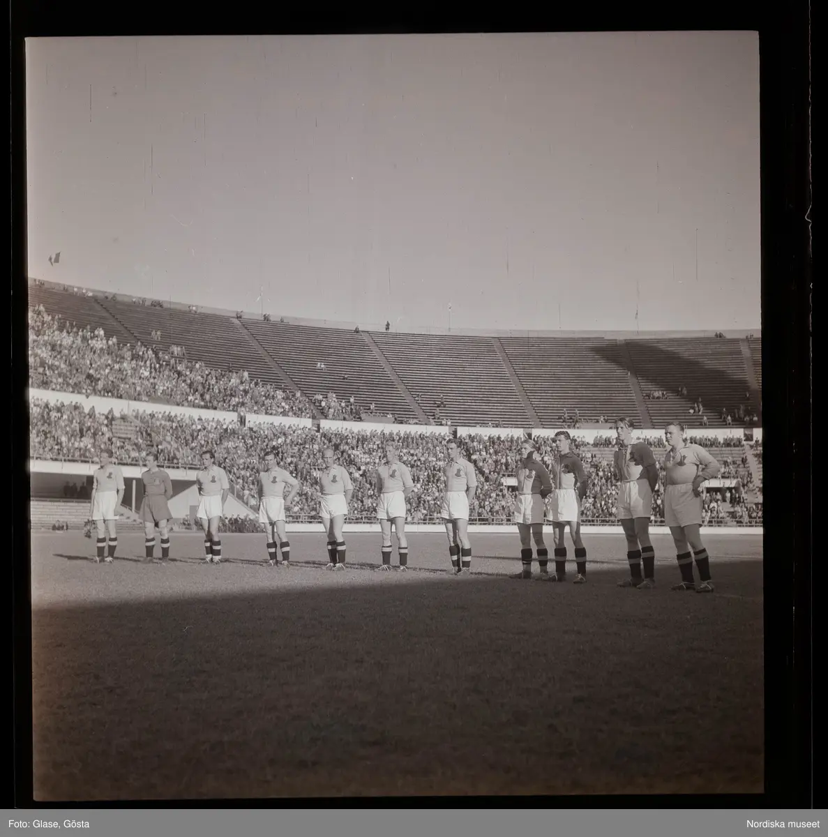 Rysk fotboll i Helsingfors mot Stockholms-kombinationen. Laguppställning på plan, publik syns i bakgrunden på arenans läktare.