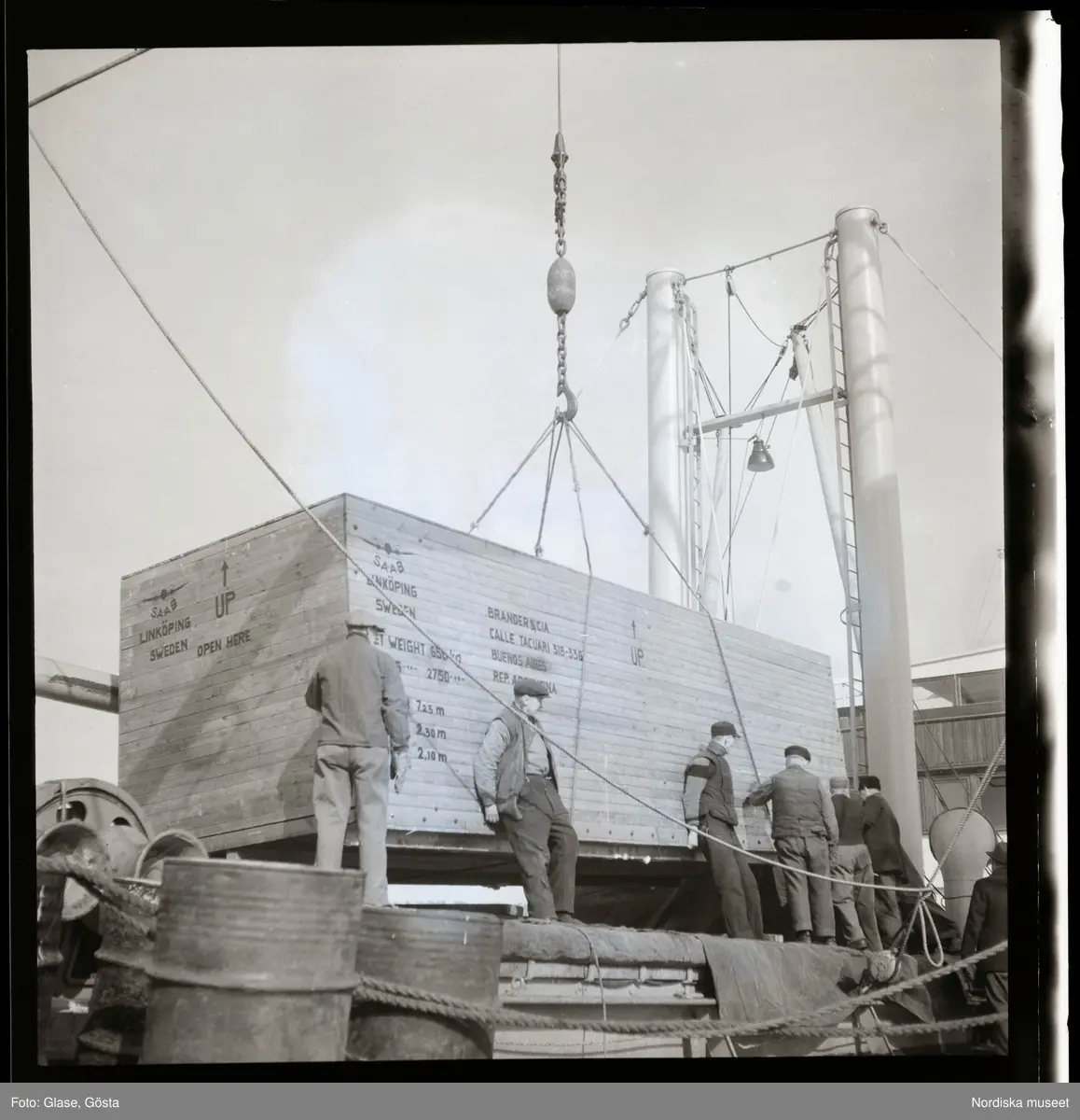 Titel: Rederi AB Nordstjernan. Ilastning av första flygplan på svensk båt till utlandet, 1947.