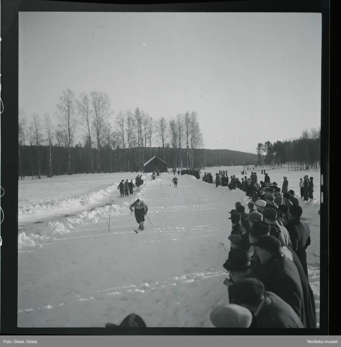 Titel: Hofors, skidtävling, varvlopp med Nisse Täpp som segrar före Östensson, 31 december 1944.
