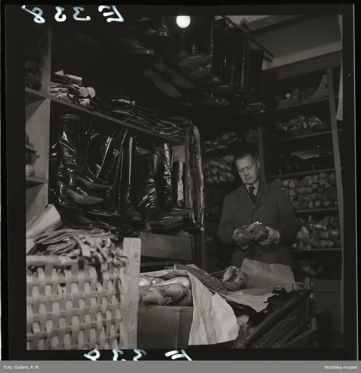 561 Operan för Allers. Kostymförråd. En man arbetar bland stövlar och skor.