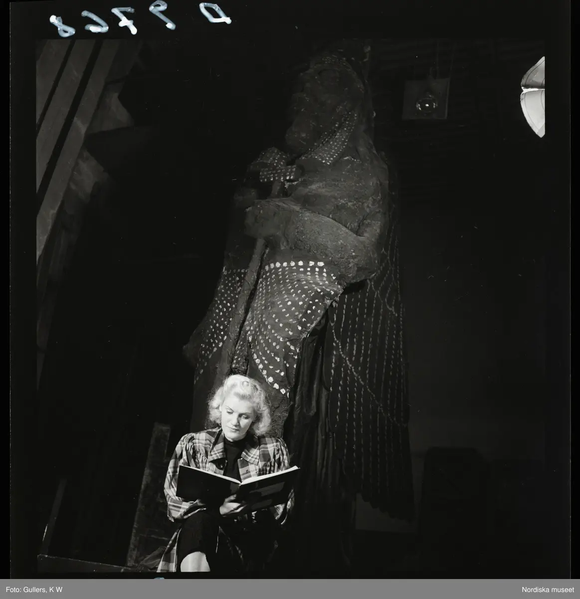 561 Operan för Allers. En kvinna sitter bakom kulisserna framför scendekor och läser manus.