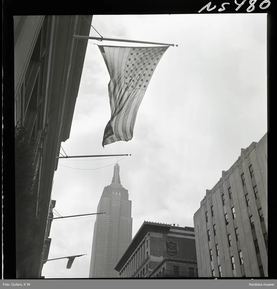 1690 New York allmänt (N.Y. Herald Tribune). Gatubild. Amerikansk flagga hänger från fasad, Empire state buildning i bakgrunden.