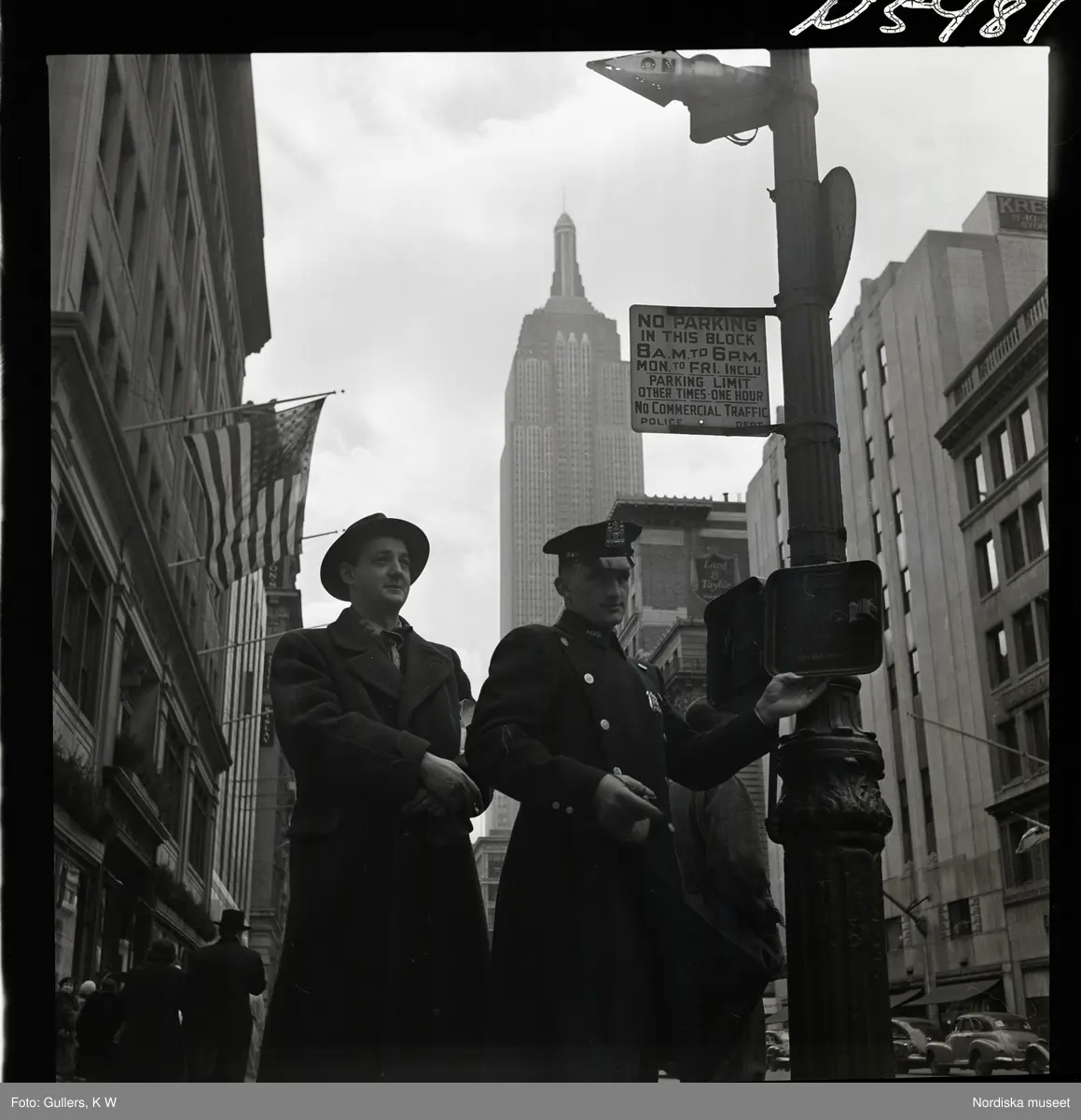 1690 New York allmänt (N.Y. Herald Tribune). Man och trafikpolis vid övergångsställe.
