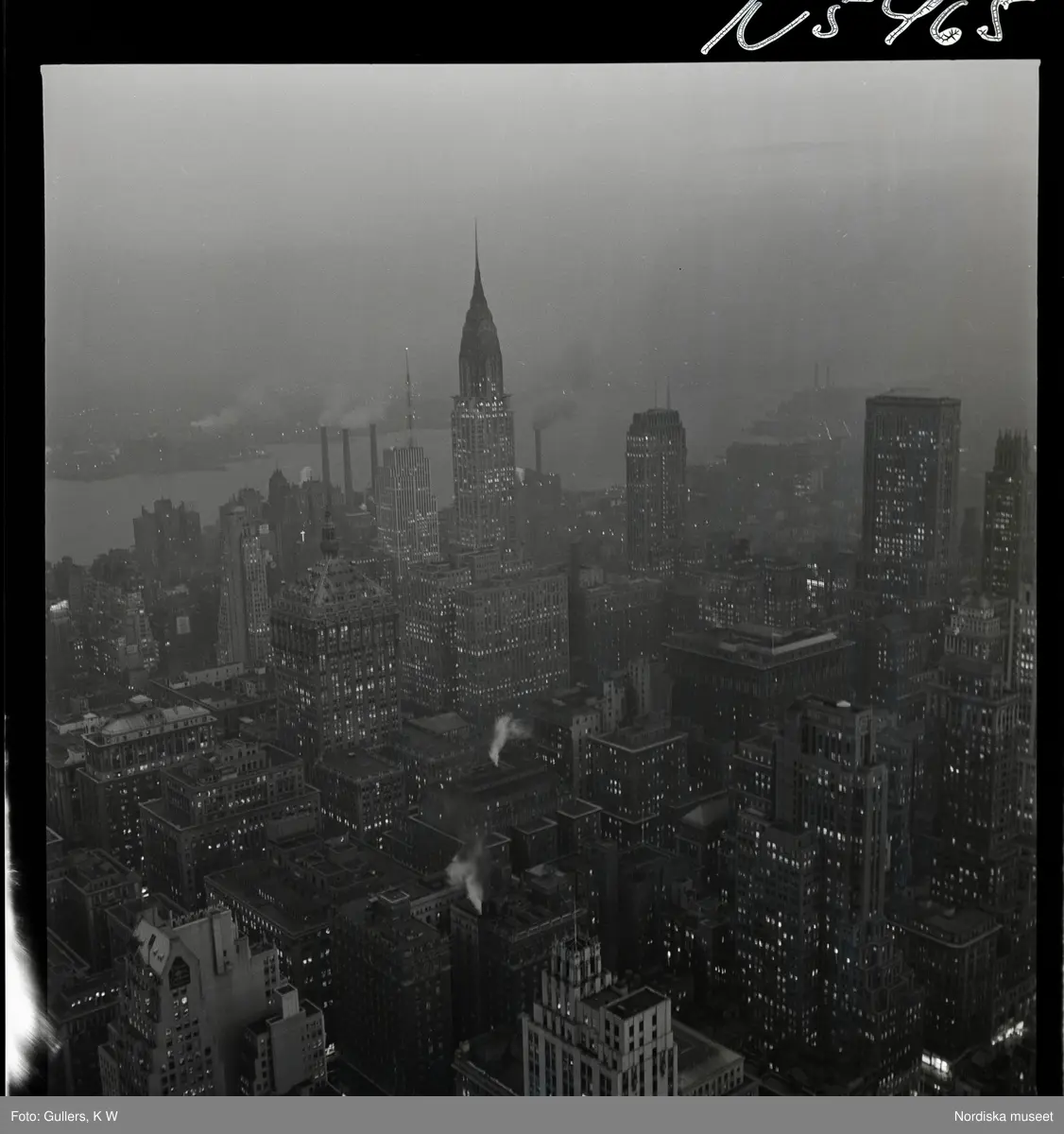 1690 New York allmänt (N.Y. Herald Tribune). Kvälls-/ nattbild. Skyskrapor.
