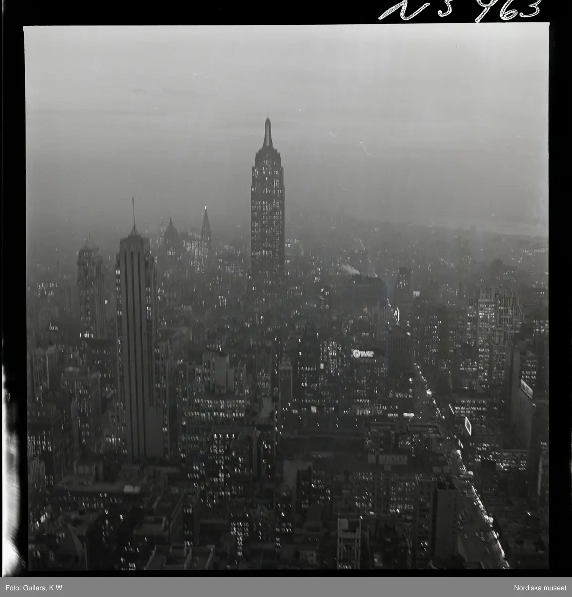 1690 New York allmänt (N.Y. Herald Tribune). Kvälls-/ nattbild. Skyskrapor.