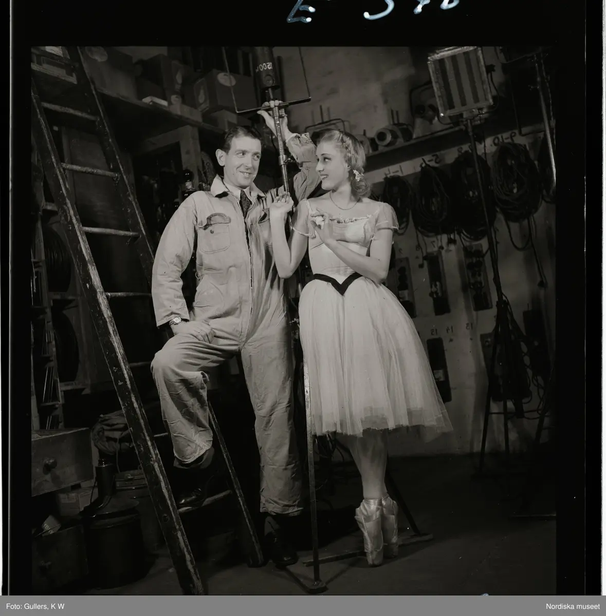 561 Operan för Allers. En kvinnlig dansare i kostym och en man i arbetare-overall, bakom kulisserna.