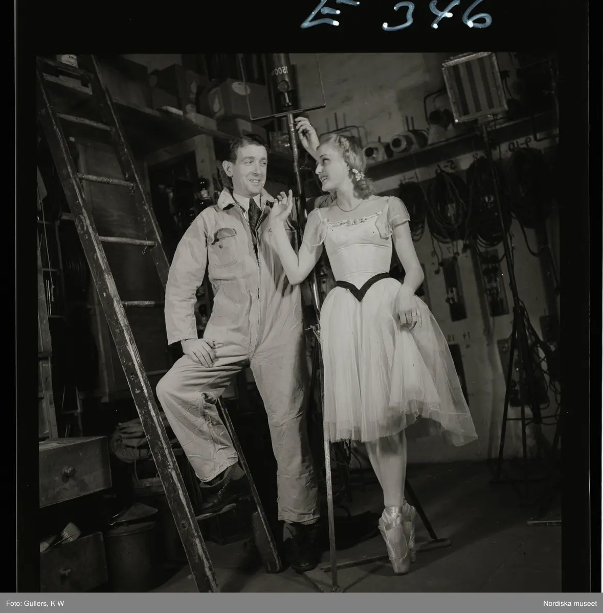 Titel: 561 Operan för Allers. En kvinnlig dansare i kostym och en man i arbetare-overall, bakom kulisserna.