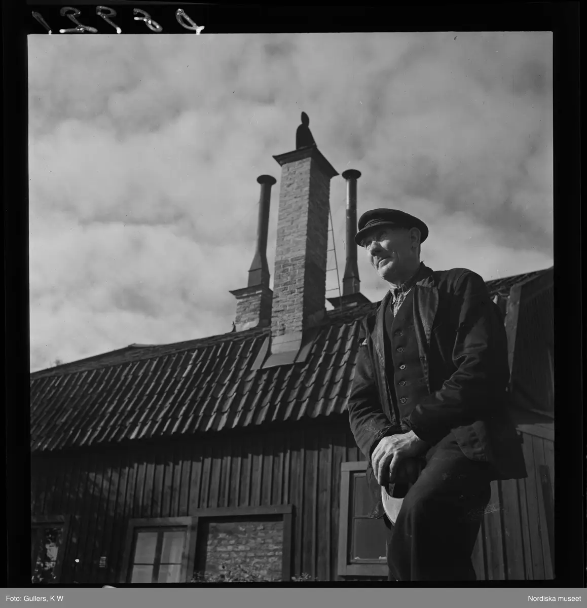 539 Söder. En man lutar sig mot sin spade framför en träkåk.