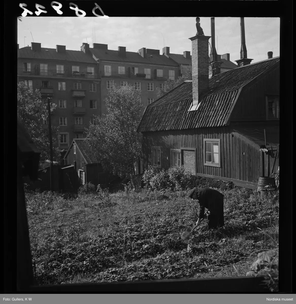 539 Söder. En man arbetar bland odlingarna framför en träkåk.