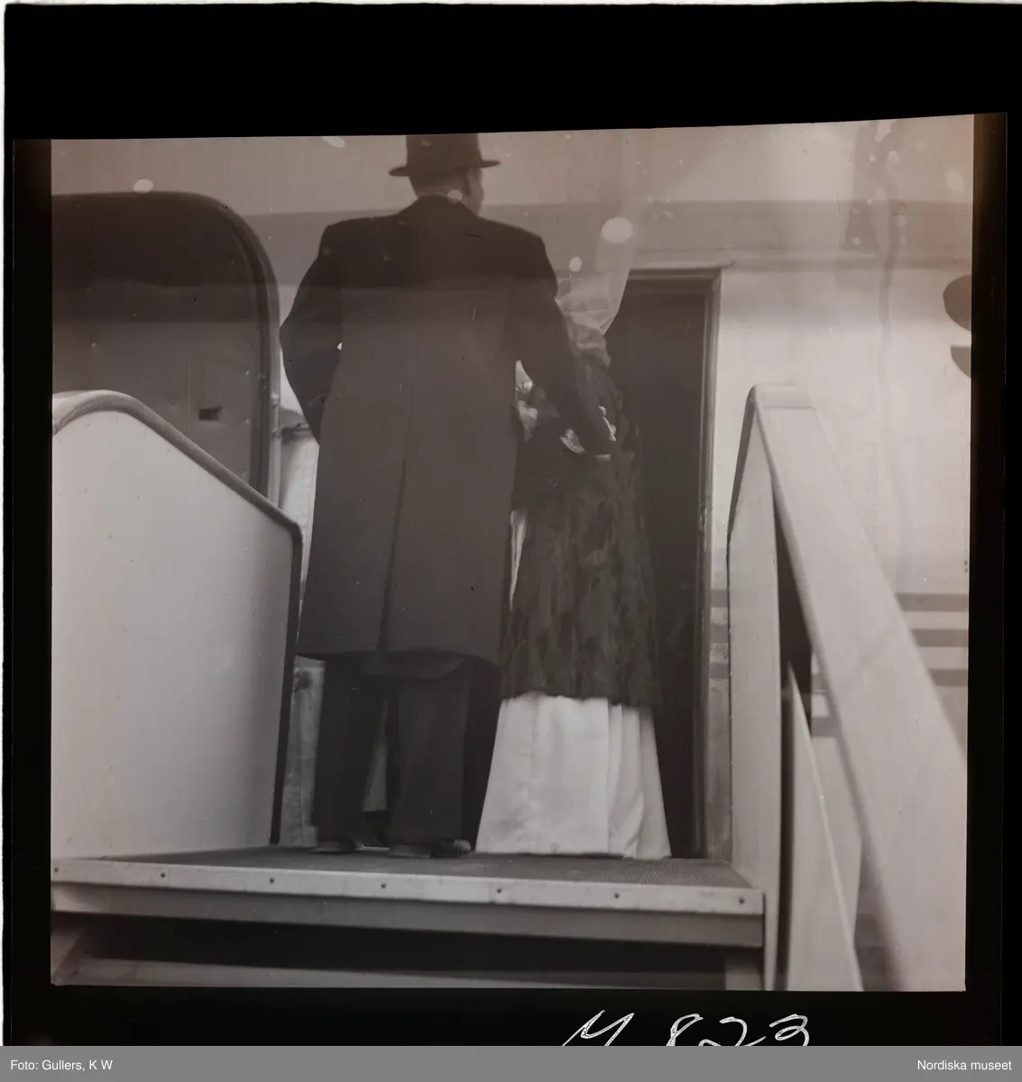 "1680 Bröllop i luften med Abas DC-4 ""Sunnan"" till Paris ". Ett brudpar stiger på ett flygplan.