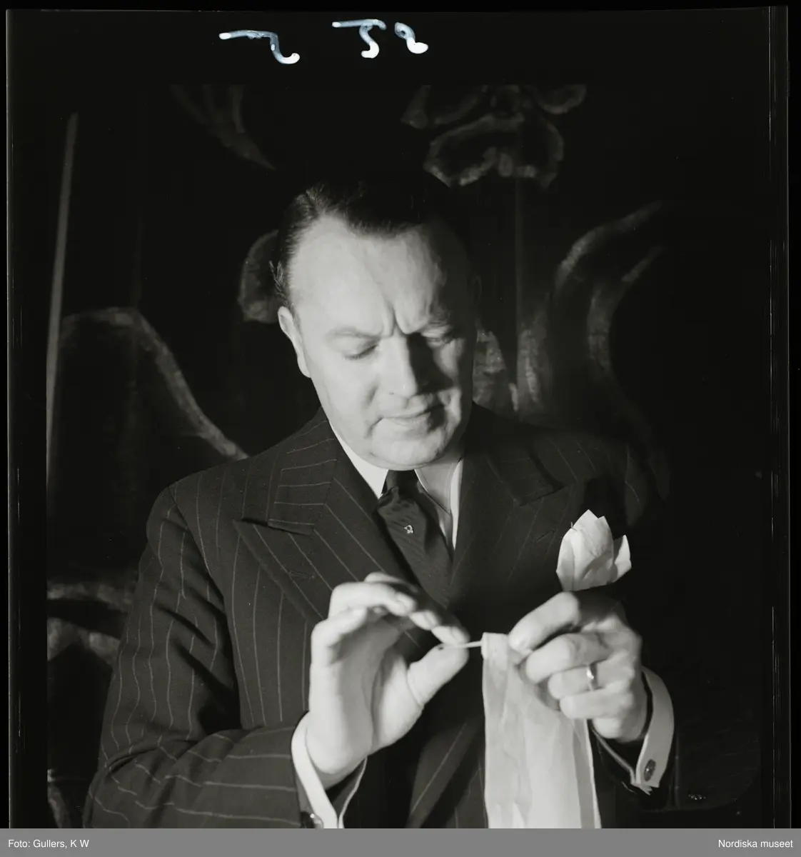 568 Trenters reportage. En man utför trolleri-trick med näsduk och tändsticka.