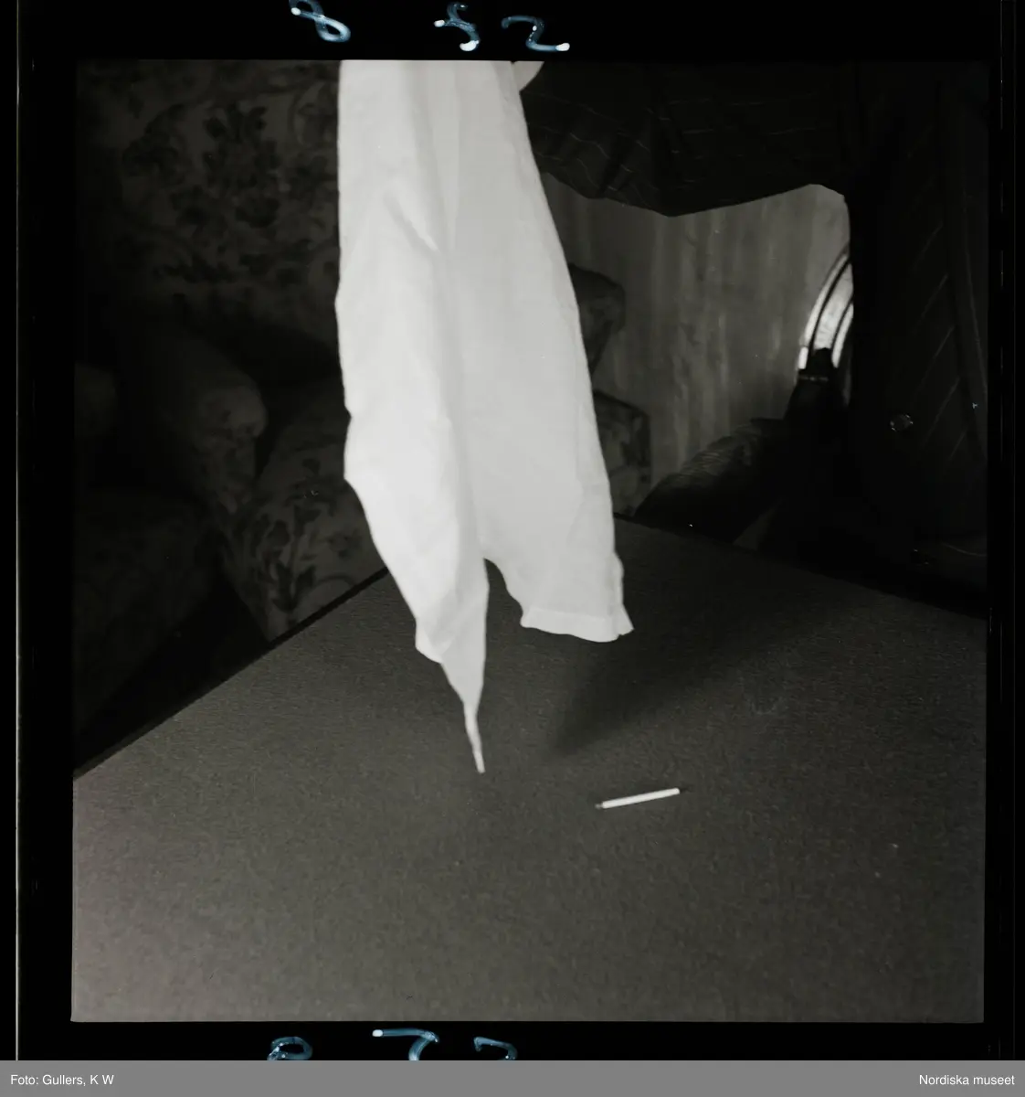 568 Trenters reportage. En man utför trolleri-trick med näsduk och tändsticka.