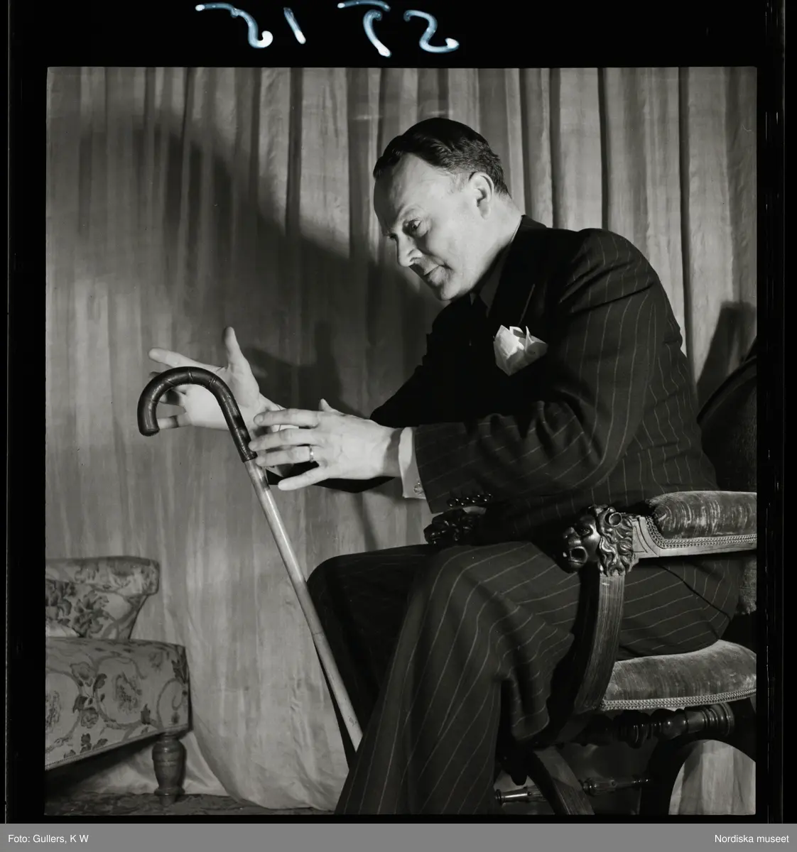 568 Trenters reportage. En man utför trolleri-trick med en käpp.