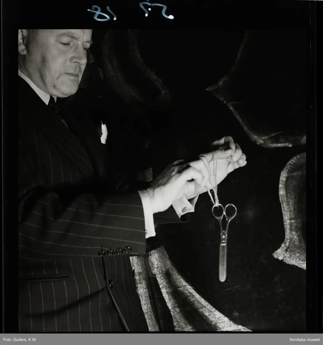 Titel: 568 Trenters reportage. En man utför trolleri-trick med en sax på snöre.