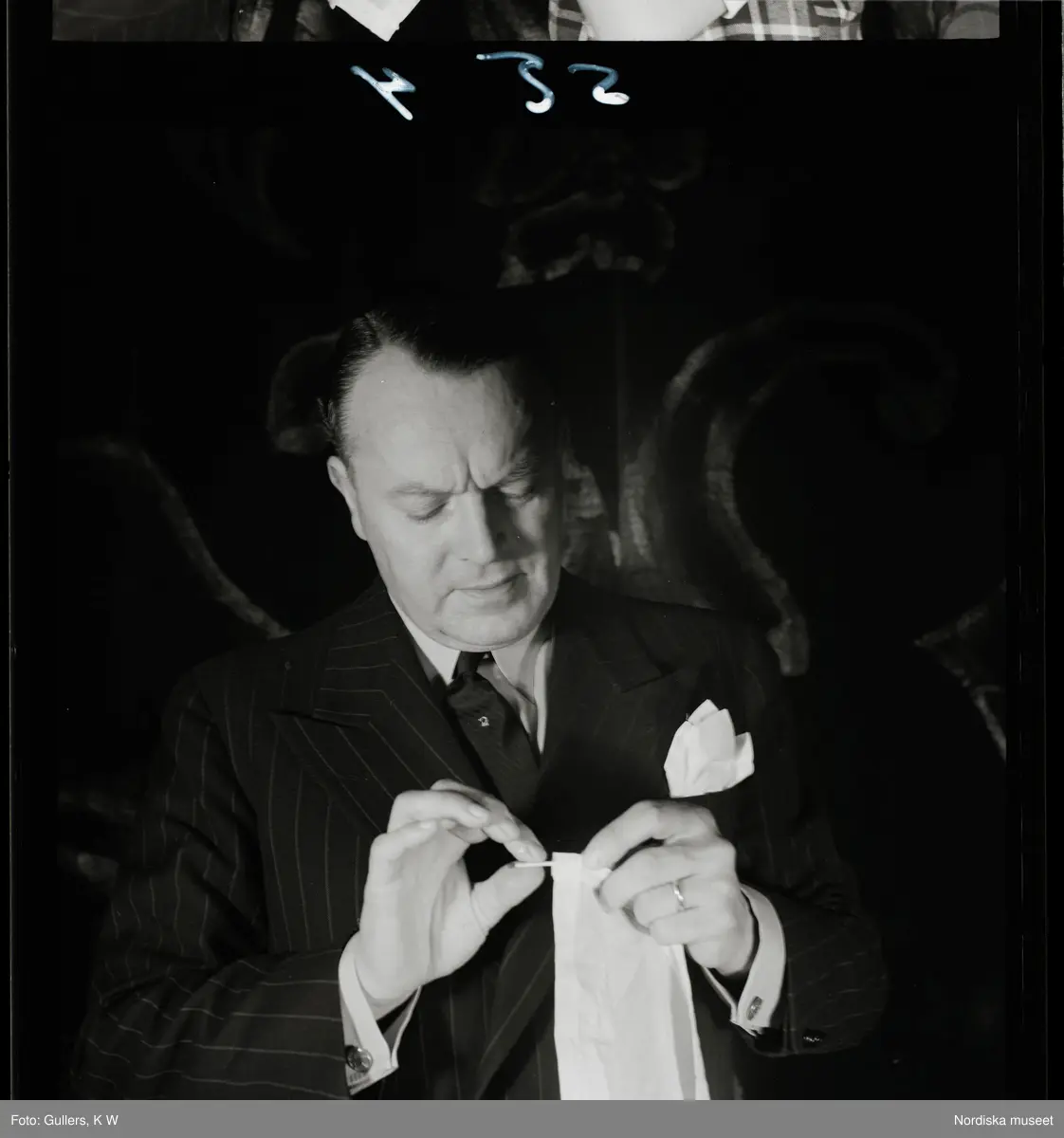 568 Trenters reportage. En man utför trolleri-trick med näsduk och tändsticka.
