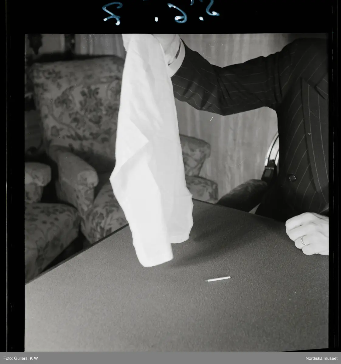 568 Trenters reportage. En man utför trolleri-trick med näsduk och tändsticka.