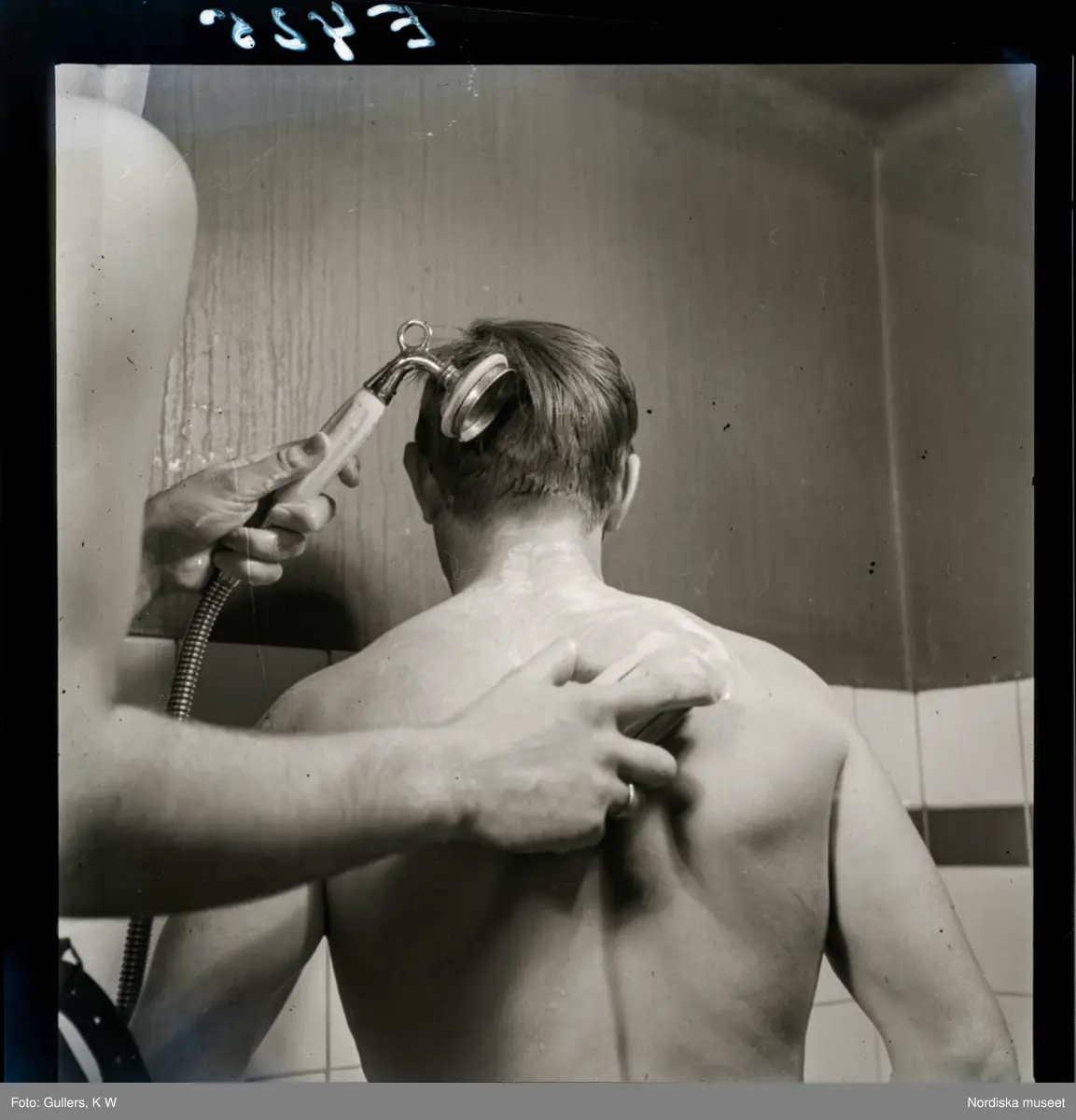 577 Skrubba mig på ryggen Omslag SE. En man duschar och tvättar en annan på ryggen.