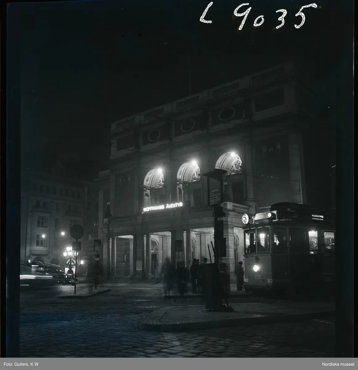 561 A Operareportage för tidningen Vi. Operahuset exteriört. Neonskylt annonserar föreställningen: Hoffmans äventyr.
