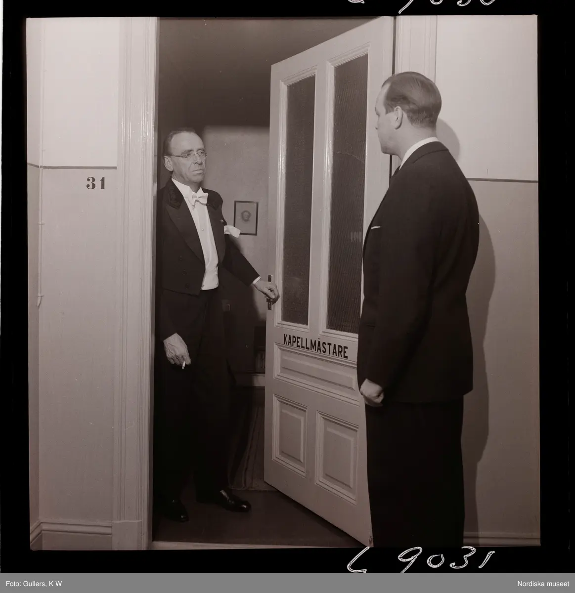 561 A Operareportage för tidningen Vi. Kapellmästaren tar emot en man i dörren till sitt kontor.
