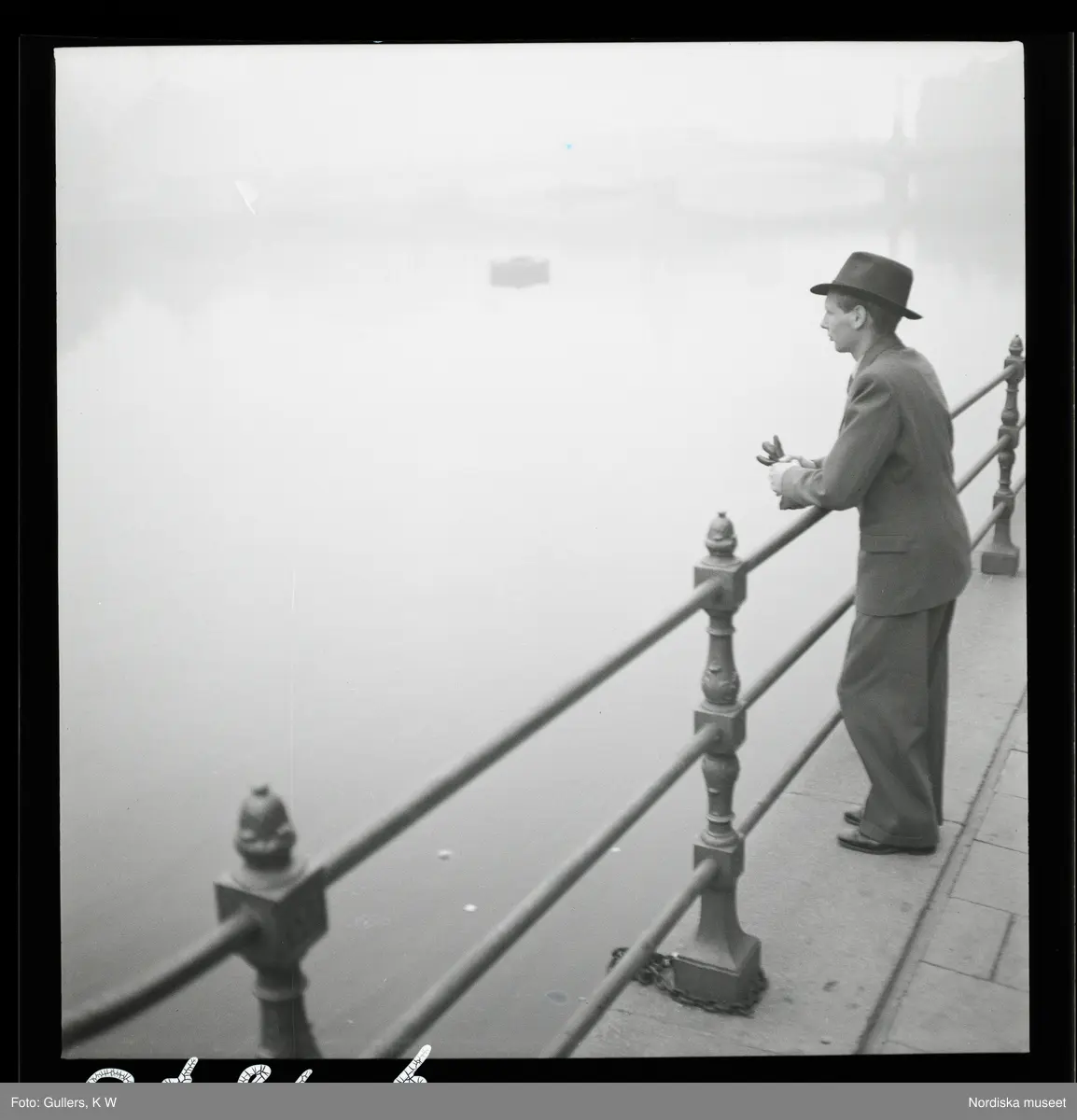 542 Dimma. En man står och blickar ut över vattnet i dimma.