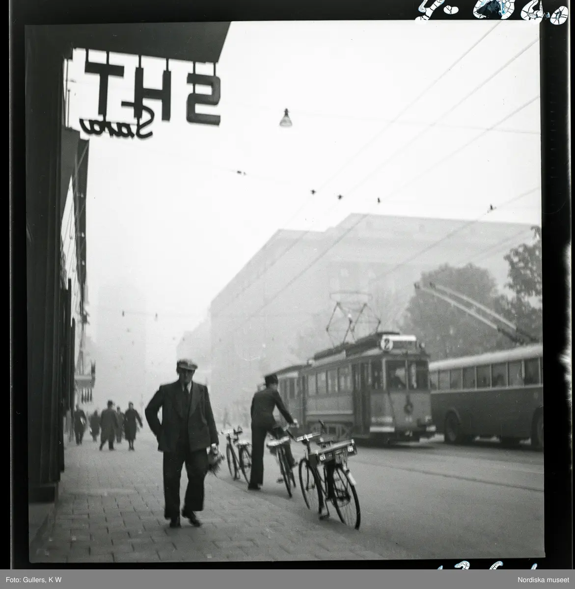 542 Dimma. Spårvagn, trådbuss, cyklist och fotgängare.