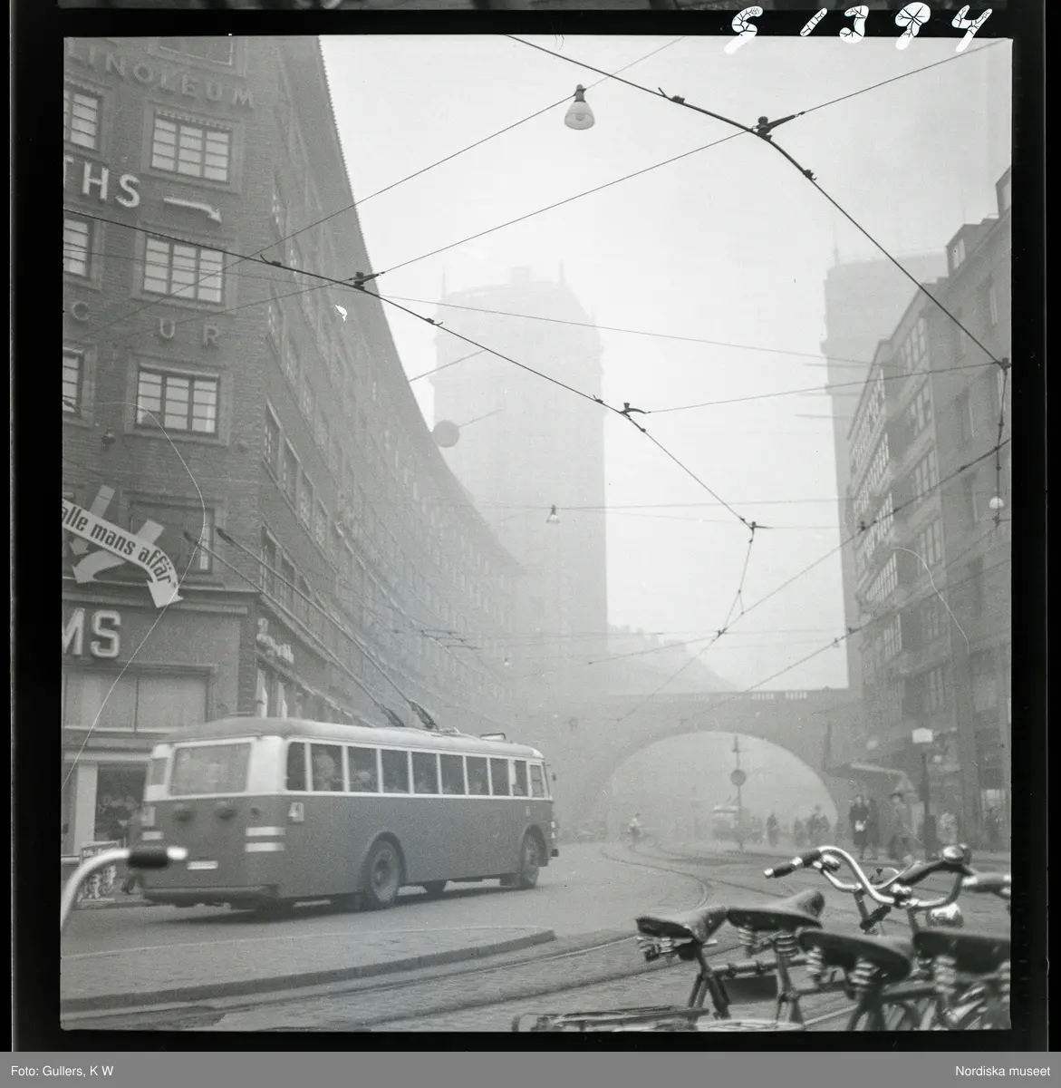 542 Dimma. Trådbuss passerar Centrumhuset i hörnet Sveavägen/Kungsgatan.