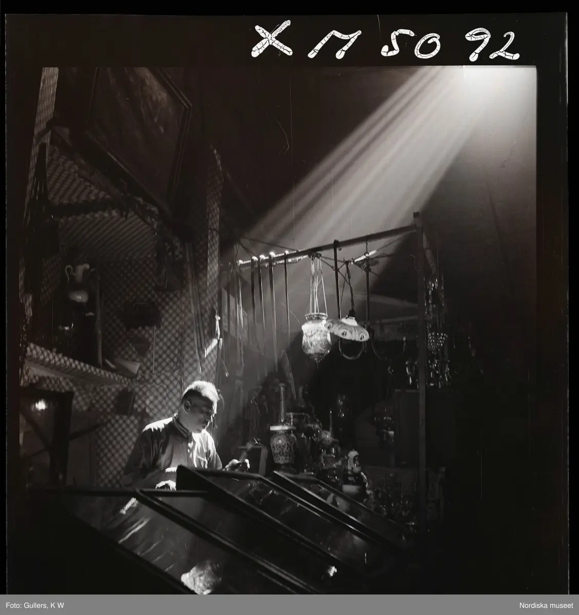 1717/L Istanbul allmänt. Ljuset från ett fönster faller på en försäljare i en butik, eventuellt marknaden i Grand Bazaar.