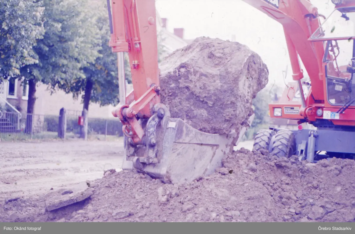 Grävmaskin tar upp stor sten, 1990-tal