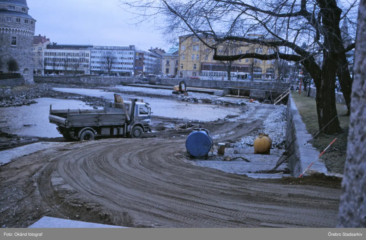 Svartån torrlagd och arbete pågår längs med Storbron, 1990-tal