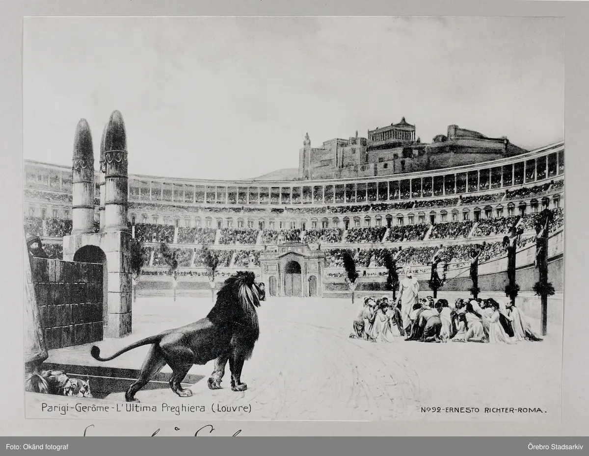 Vykort som visar scen från Colosseums arena med lejon, 1913